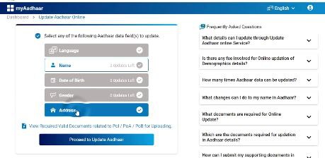 Screen thar alo lang leh anga, Procees to Update Aadhaar tih kha i hmet leh ang. Chumi zawhah chuan, i Update theih tur alo lang thla anga, Language, Name, Date of Birth, Gender, Address tih alo awm ang. Address hi kan tih tum anih avangin Address tih kha i hmet tawp anga, chuan a hnuaia, Proceed to Update Aadhaar tih kha i hmet leh ang.